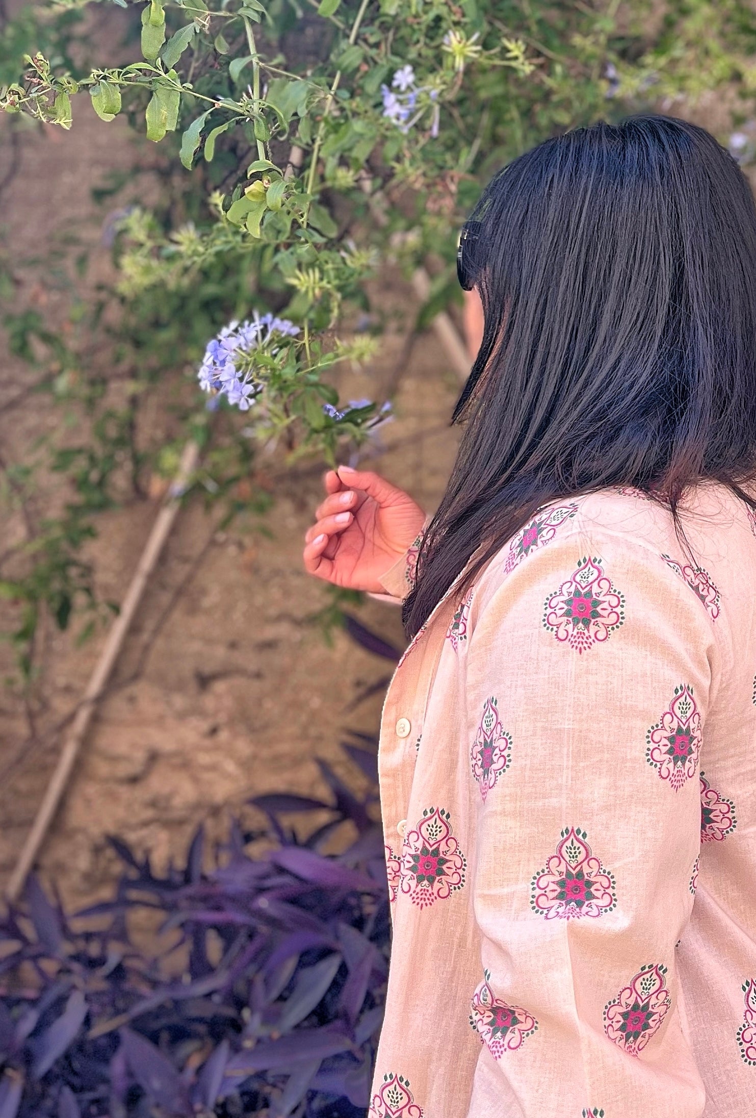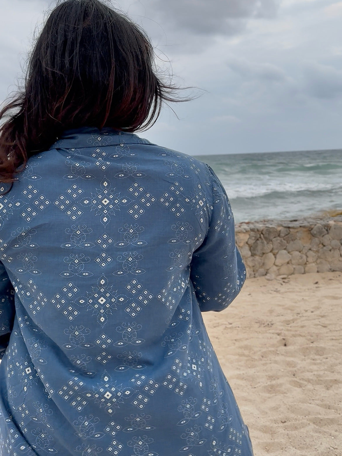 Bandhani shirt dress in a shade of denim blue. Made using organic cotton cambric, she's airy and lightweight. In Sanskrit, Arya means noble and honourable.